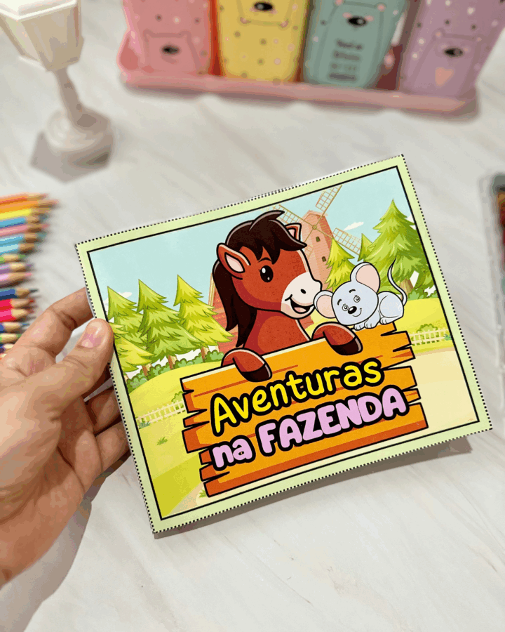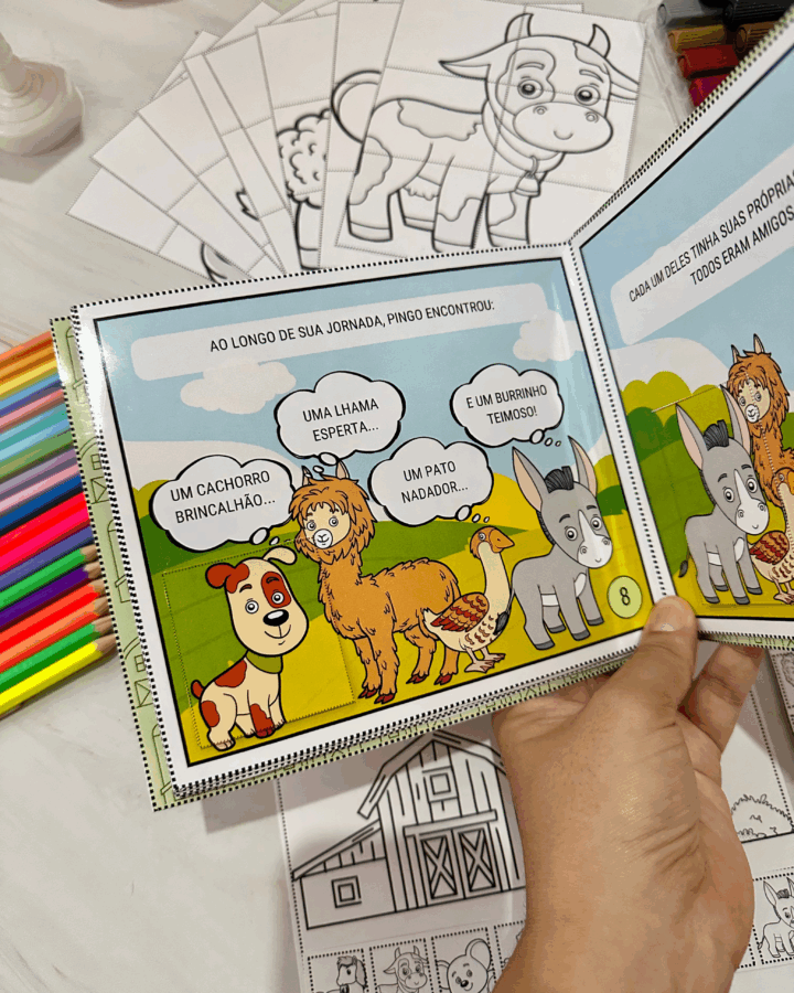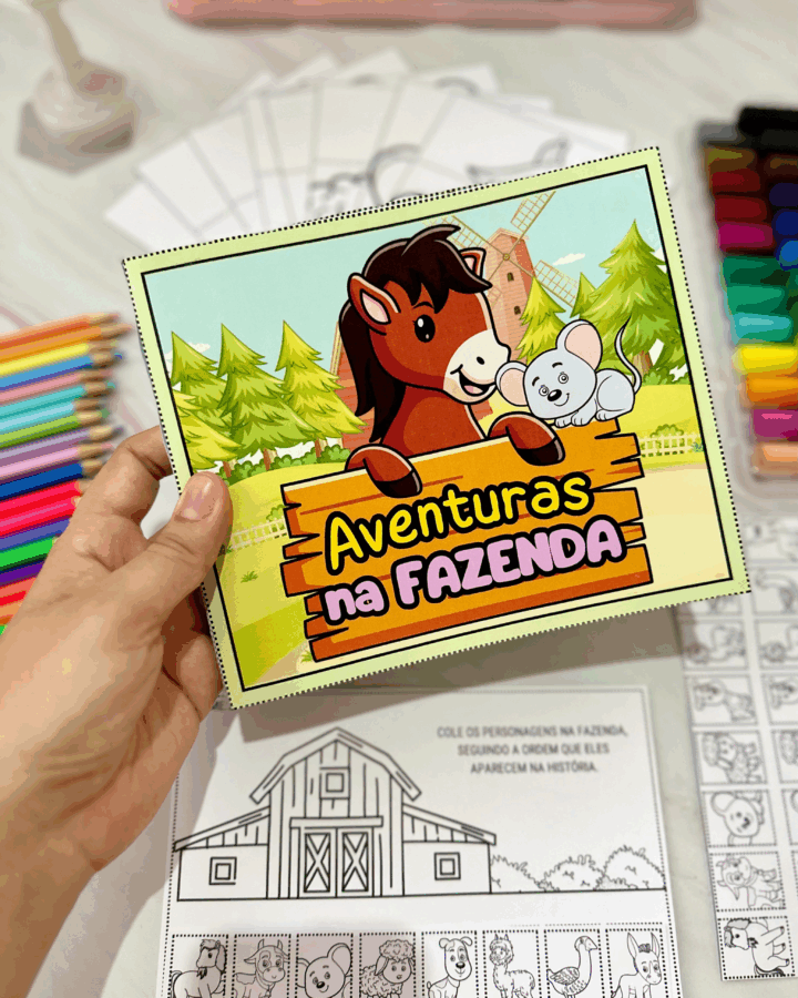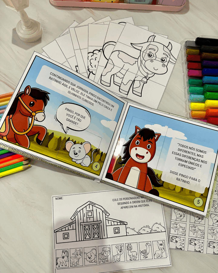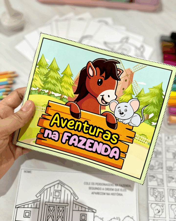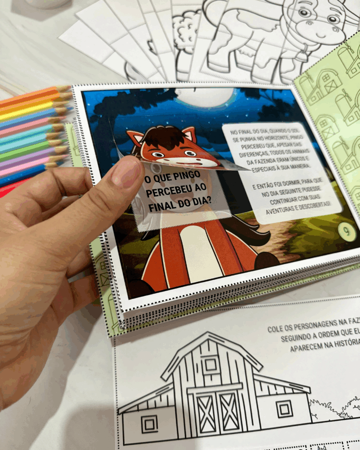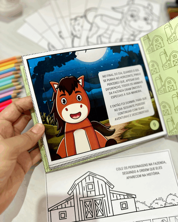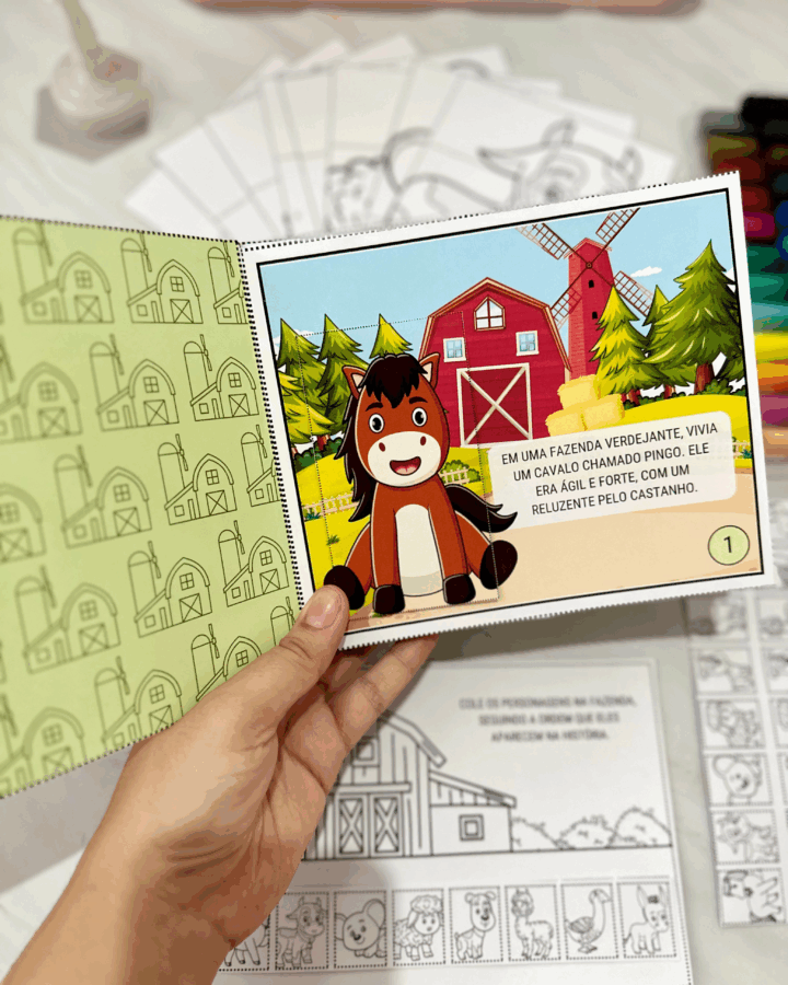 personagensna fazendade acordo com a ordem que eles aparecem nahistória, e todos ospersonagenspara a criança colorir, recortar e montarno