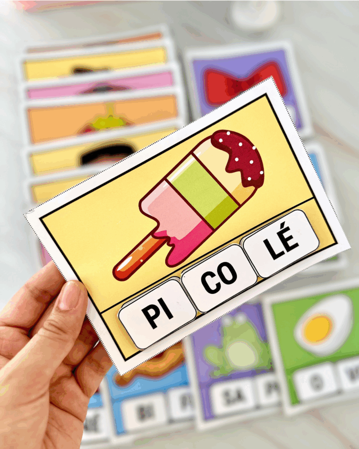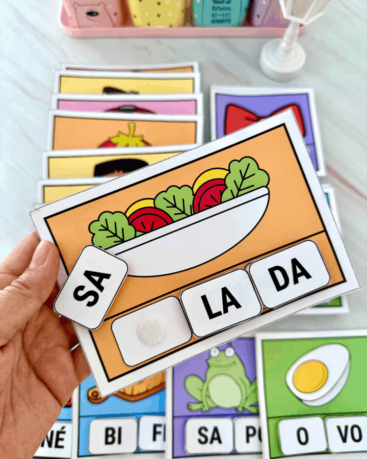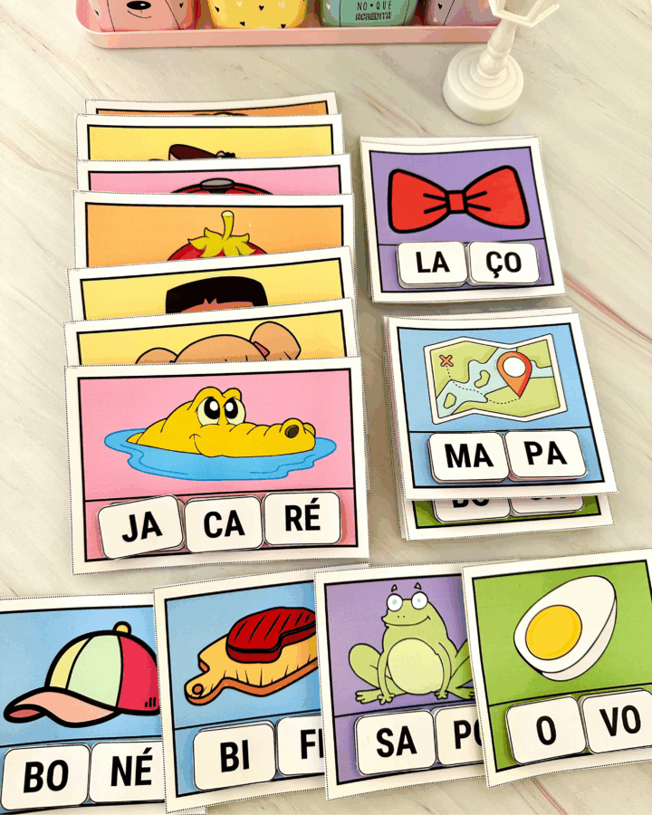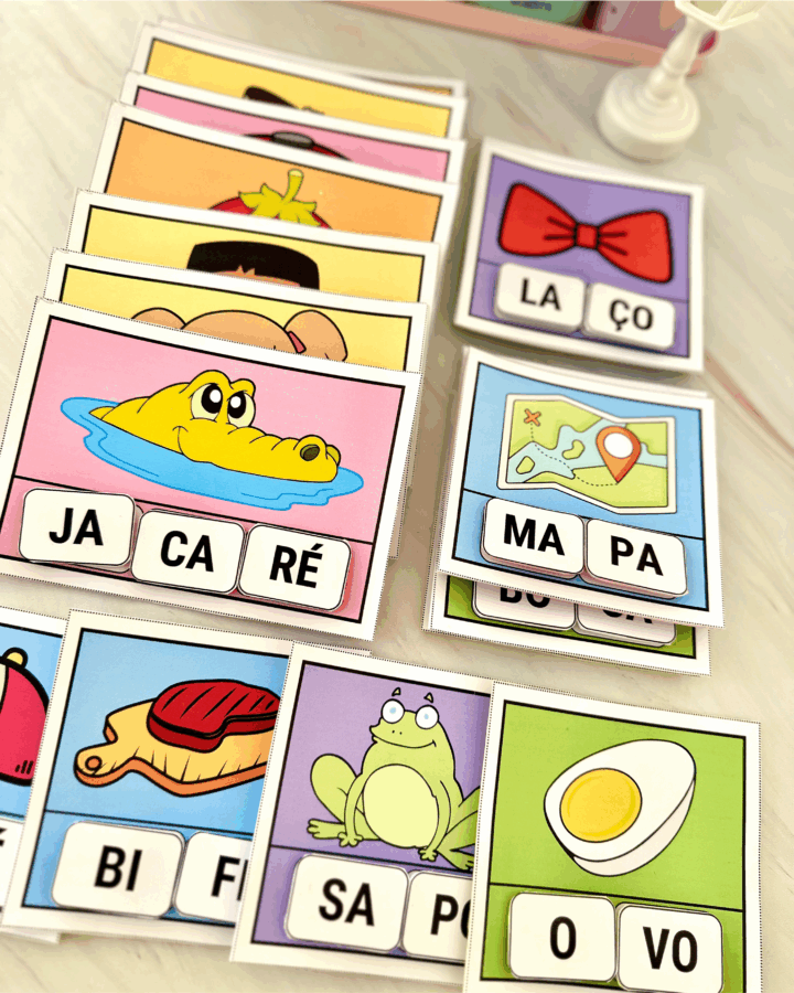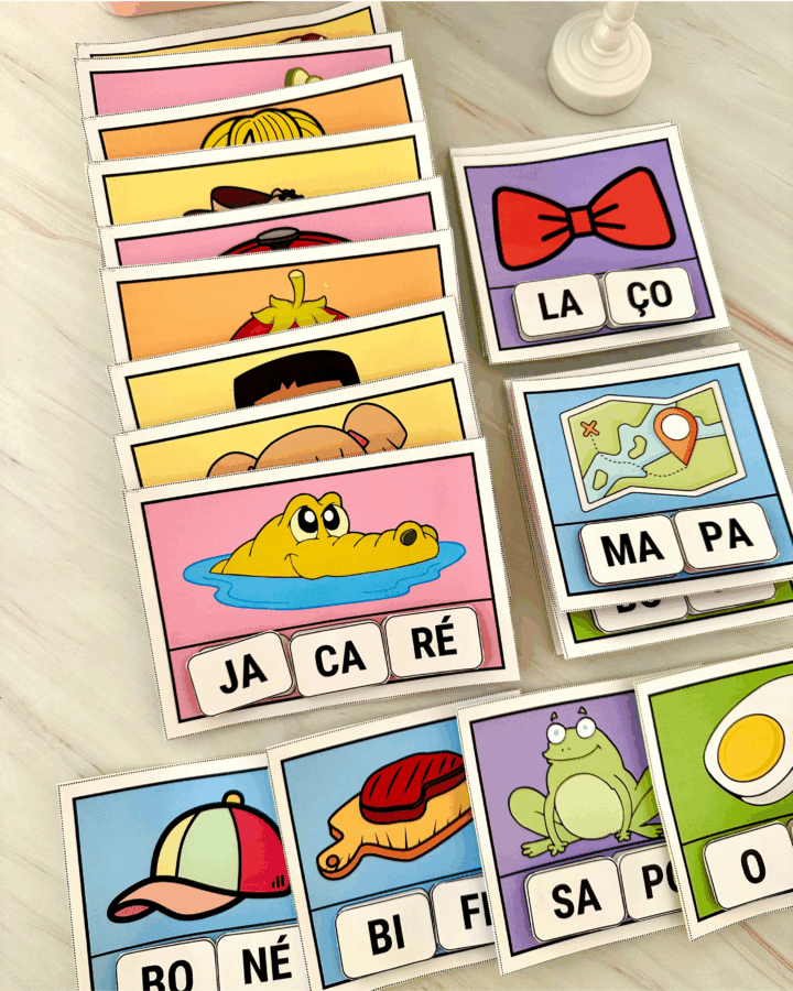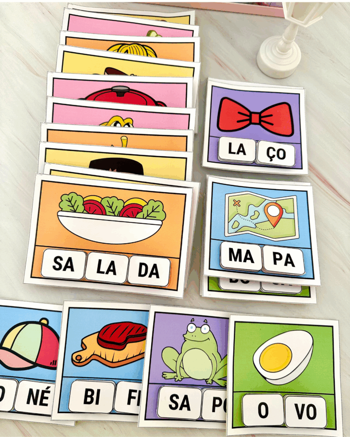 com diferentes imagens e com silabas móveis para a criança organizar